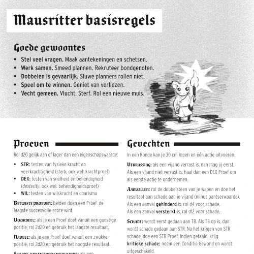 Meer horen over Mausritter? Kijk dan de video van Nox’ Spellenzolder over de Nederlandse editie van Mausritter of luister naar aflevering 7 van seizoen 2 van DND met een zachte G (een Nederlandstalige podcast over TTRPGs), waarin Mausritter en andere rollenspellen in dit genre worden besproken.